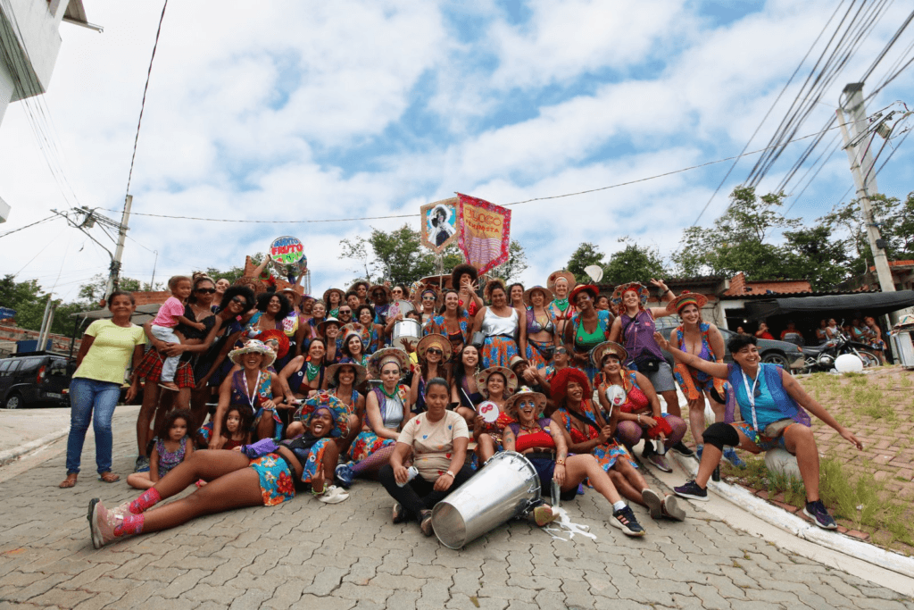 El Bloco Feminista surgió en 2021 durante las manifestaciones en defensa de la democracia en Brasil. A pesar de la pandemia, salimos a las calles de São Paulo con máscaras e instrumentos para luchar por nuestros derechos. A través de estas manifestaciones, formamos un grupo diverso liderado por mujeres, donde el aprendizaje se daba de manera práctica, compartiendo conocimientos. Después de las manifestaciones, las mujeres que organizaron el bloque fundaron un colectivo comunitario de carnaval, considerándose un colectivo sociocultural y político que utiliza el arte como herramienta de lucha.